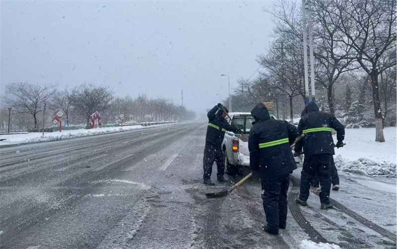 降雪后,按照“雪隨下隨清”的原則,待命隊員迅速行動,在包保路段通過滾刷鏟雪、撒布融雪劑、人工清掃等方式循環(huán)作業(yè),高效開展除雪工作。